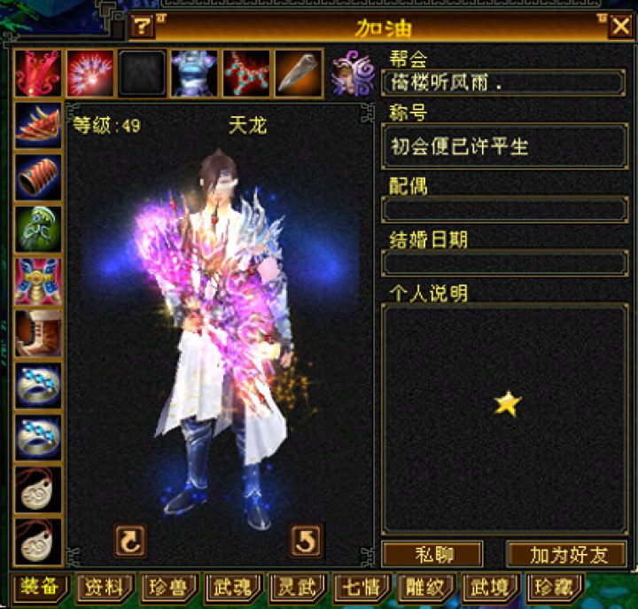 各位老铁,今天给大家介绍的是来自【梦回苍山】服务器一位49级天龙卡级选手: